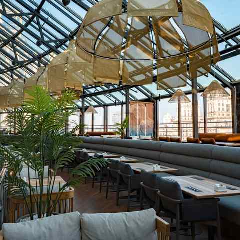 Особое внимание уделено веганским и вегетарианским позициям. Меню представлено на русском и английском языках, что делает выбор удобным для всех гостей. С 12:00 до 16:00 в ресторане действует обеденное меню с комплексами по фиксированным ценам, что особенно удобно для тех, кто ценит время.